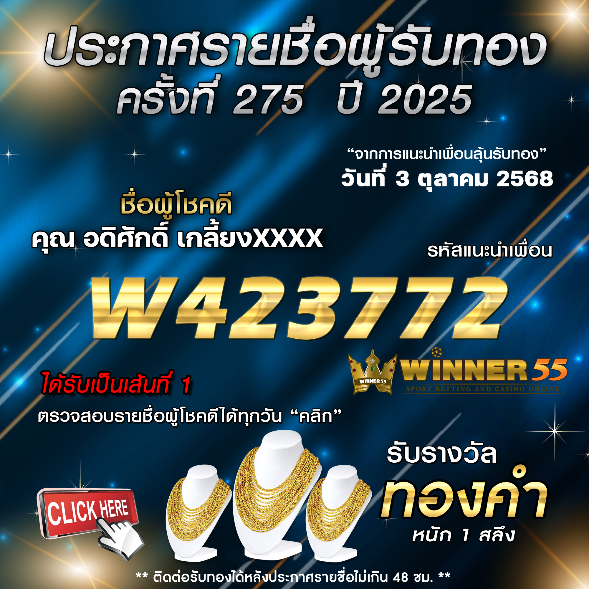 ประกาศรายชื่อผู้โชคดี อดิศักดิ์ เกลี้ยงxxxx ได้รับทองคำหนัก 1 สลึง ประจำวันที่ 03 ตุลาคม 2568 03/10/2025