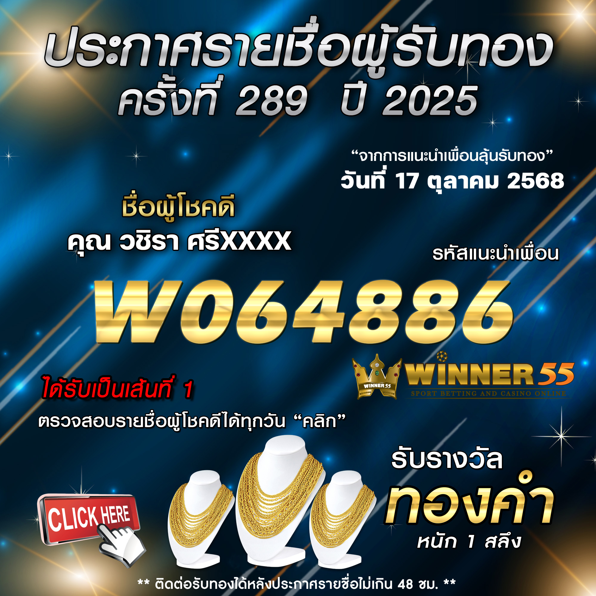 ประกาศรายชื่อผู้โชคดี วชิรา ศรีxxxx ได้รับทองคำหนัก 1 สลึง ประจำวันที่ 17 ตุลาคม 2568