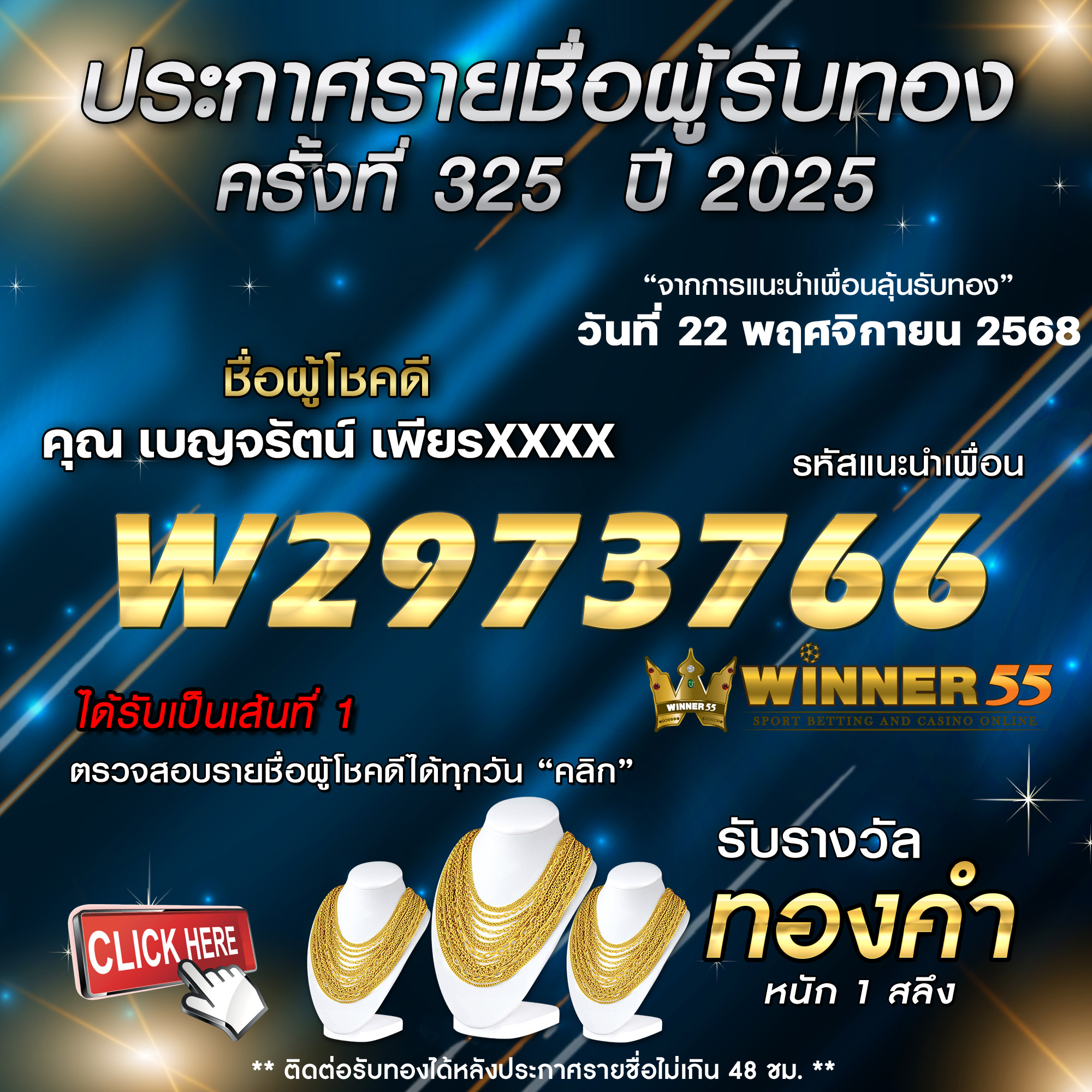 ประกาศรายชื่อผู้โชคดี เบญจรัตน์ เพียรxxxx ได้รับทองคำหนัก 1 สลึง ประจำวันที่ 22 พฤศจิกายน 2568