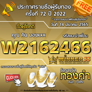 ประกาศรายชื่อผู้โชคดี คุณ คิน มองxxx ได้รับทองคำหนัก 1 สลึง ประจำวันที่ 14 มีนาคม 2565