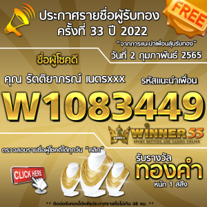 ประกาศรายชื่อผู้โชคดี คุณ รัตติยาภรณ์ เนตรxxx ได้รับทองคำหนัก 1 สลึง ประจำวันที่ 2 กุมภาพันธ์ 2565