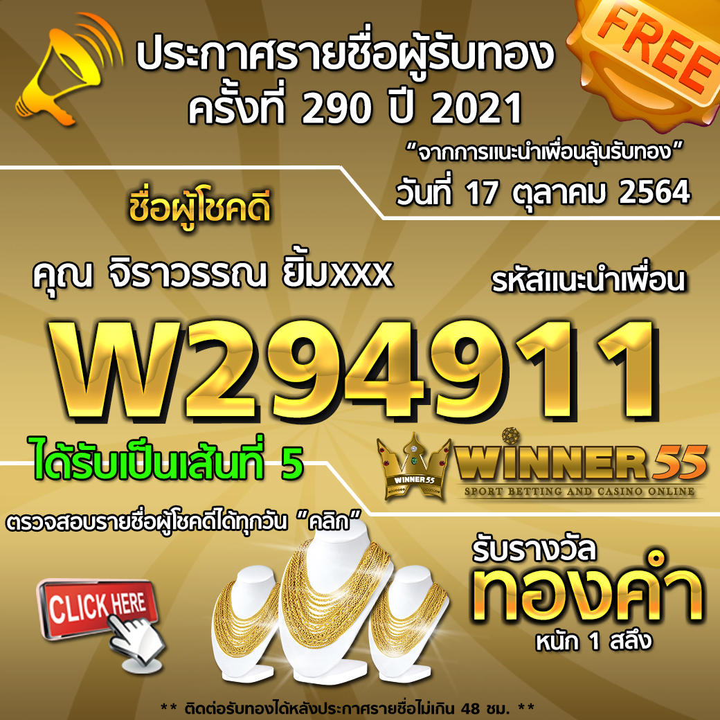 ประกาศรายชื่อผู้โชคดี คุณ จิราวรรณ ยิ้มxxx ได้รับทองคำหนัก 1 สลึง ประจำวันที่ 17 ตุลาคม 2564 17/10/2021