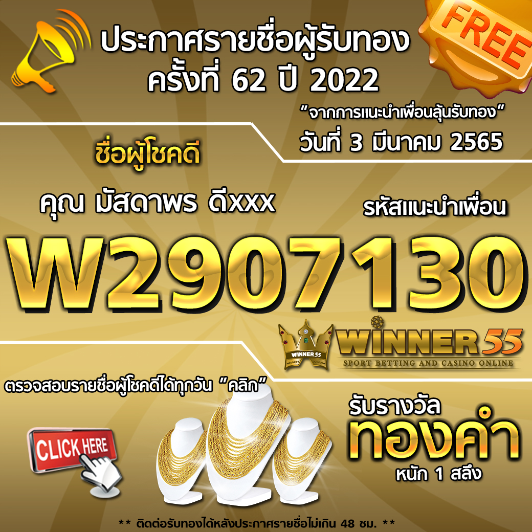 ประกาศรายชื่อผู้โชคดี คุณ มัสดาพร ดีxxx ได้รับทองคำหนัก 1 สลึง ประจำวันที่ 3 มีนาคม 2565 03/03/2022